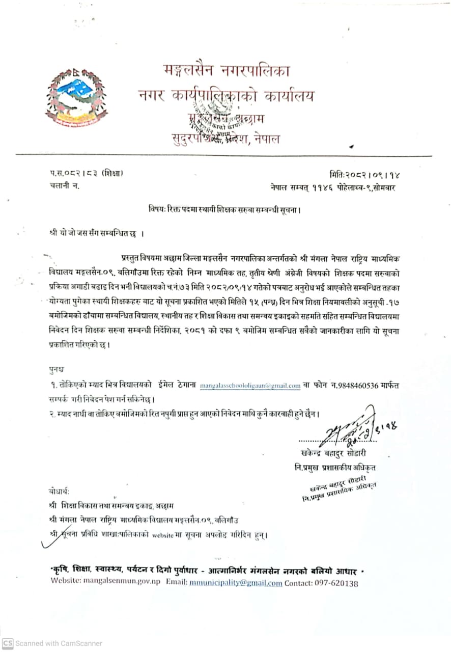 मङ्गलसेन नगरपालिका अन्तर्गत बालिबिकास आधारभूत विद्यालय मङ्गलसेन -१४ कालागाउँमा रिक्त रहेको प्राथमिक तह, तृतीय क्ष्रेणी पदमा शिक्षक सरुवा सम्बन्धी सूचना |