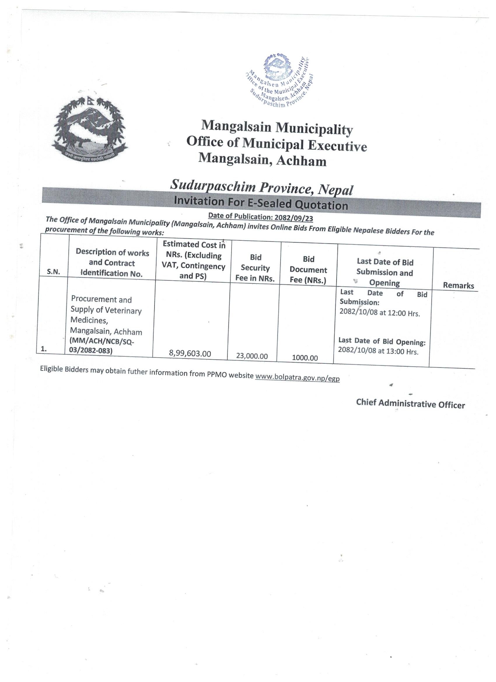 » Invitation For E-Sealed Quotation (Veterinary Medicines)