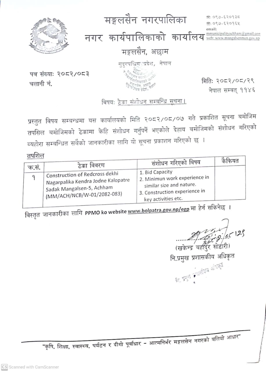 ठेक्का संशोधन सम्बन्धि सूचना |(Construction of Redcross dekhi Nagarpalika Kendra -Jodne Kalopatre Sadak Mangalsen-5, Achham (MM/ACH/NCB/W-01/2082-083)