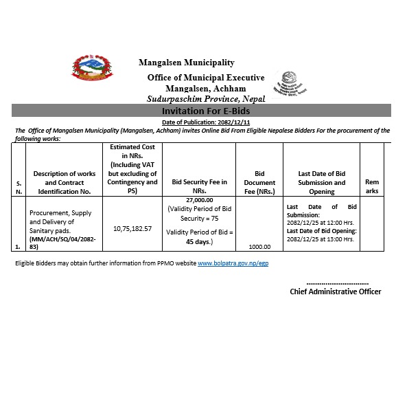 E-Bid For Procurement, Supply And Delivery Of Sanitary Pads.