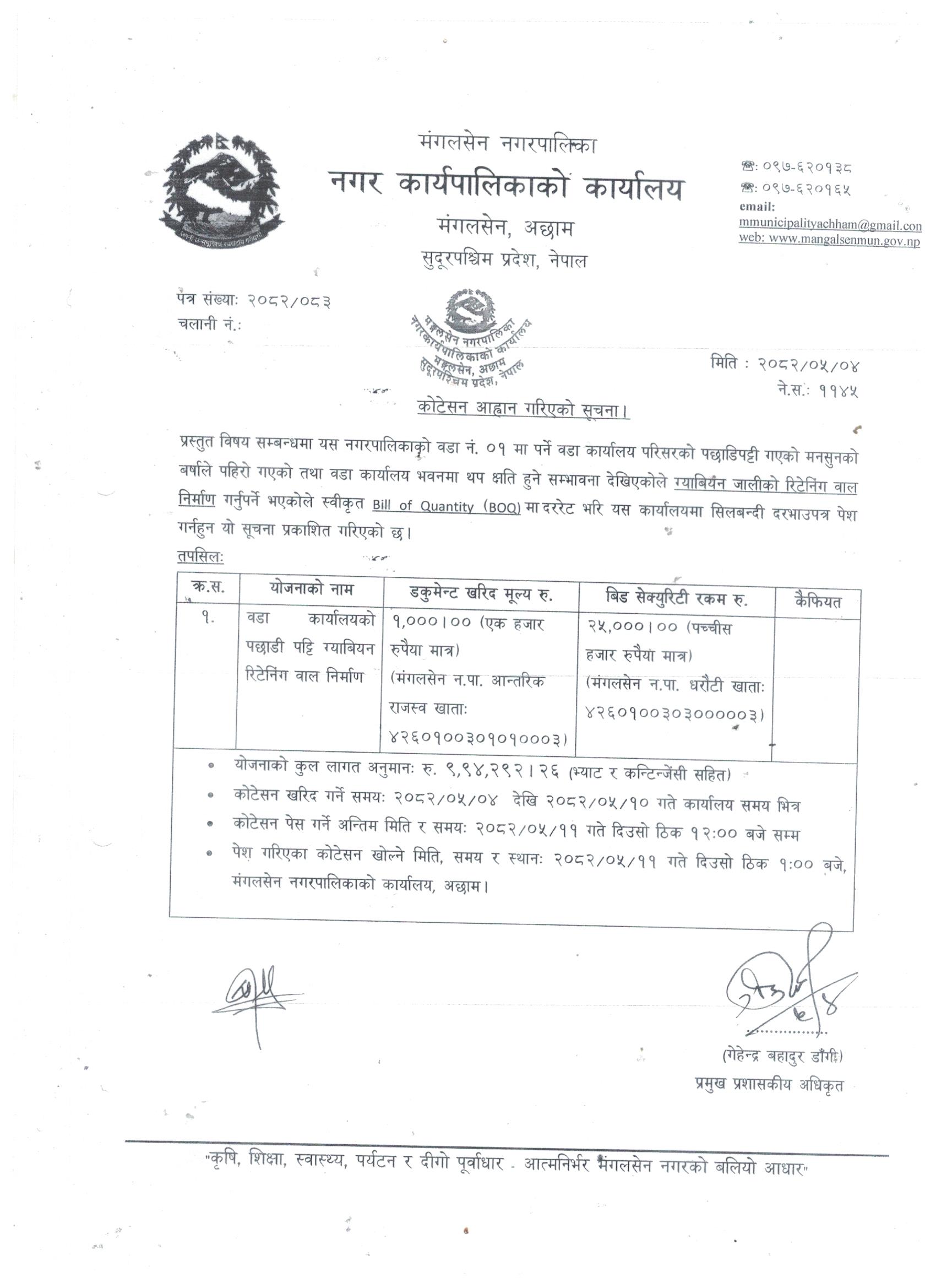 बोल पत्र स्वीकृत गर्ने आशयको सूचना (Construction Of Gabion Retaining wall at backside of ward office building, Mangaslen-1,Achham )