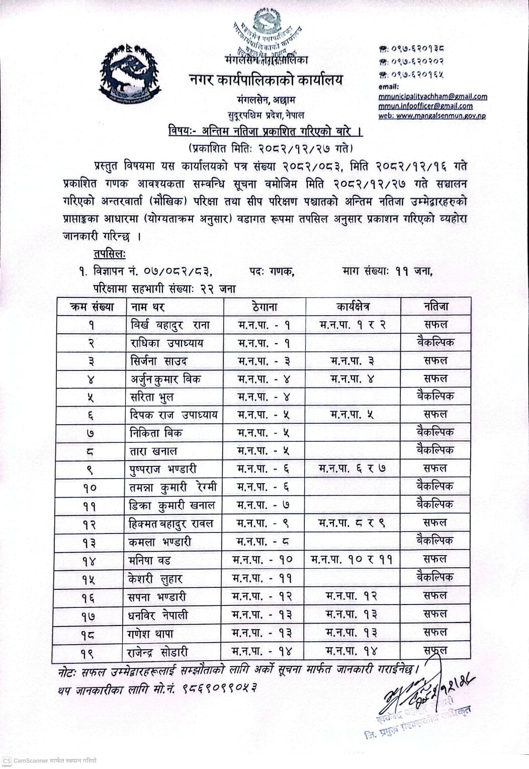 अन्तिम नतिजा प्रकासित गरिएको बारे |