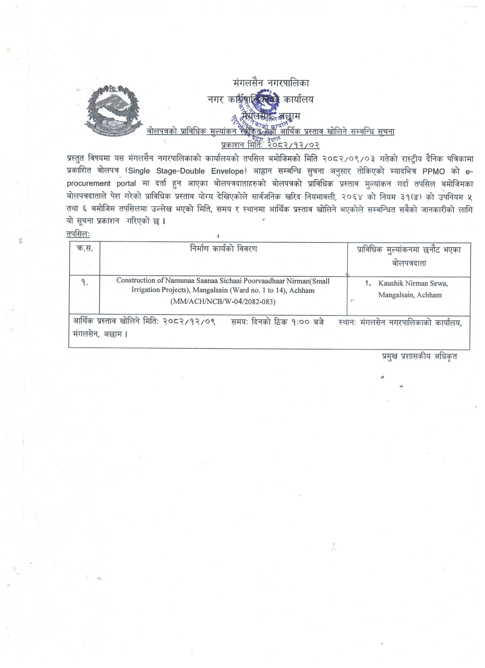 बोलपत्रको प्राविधिक मुल्यांकन स्वीकृत तथा आर्थिक प्रस्ताव खोलिने सम्बन्धी सूचना |