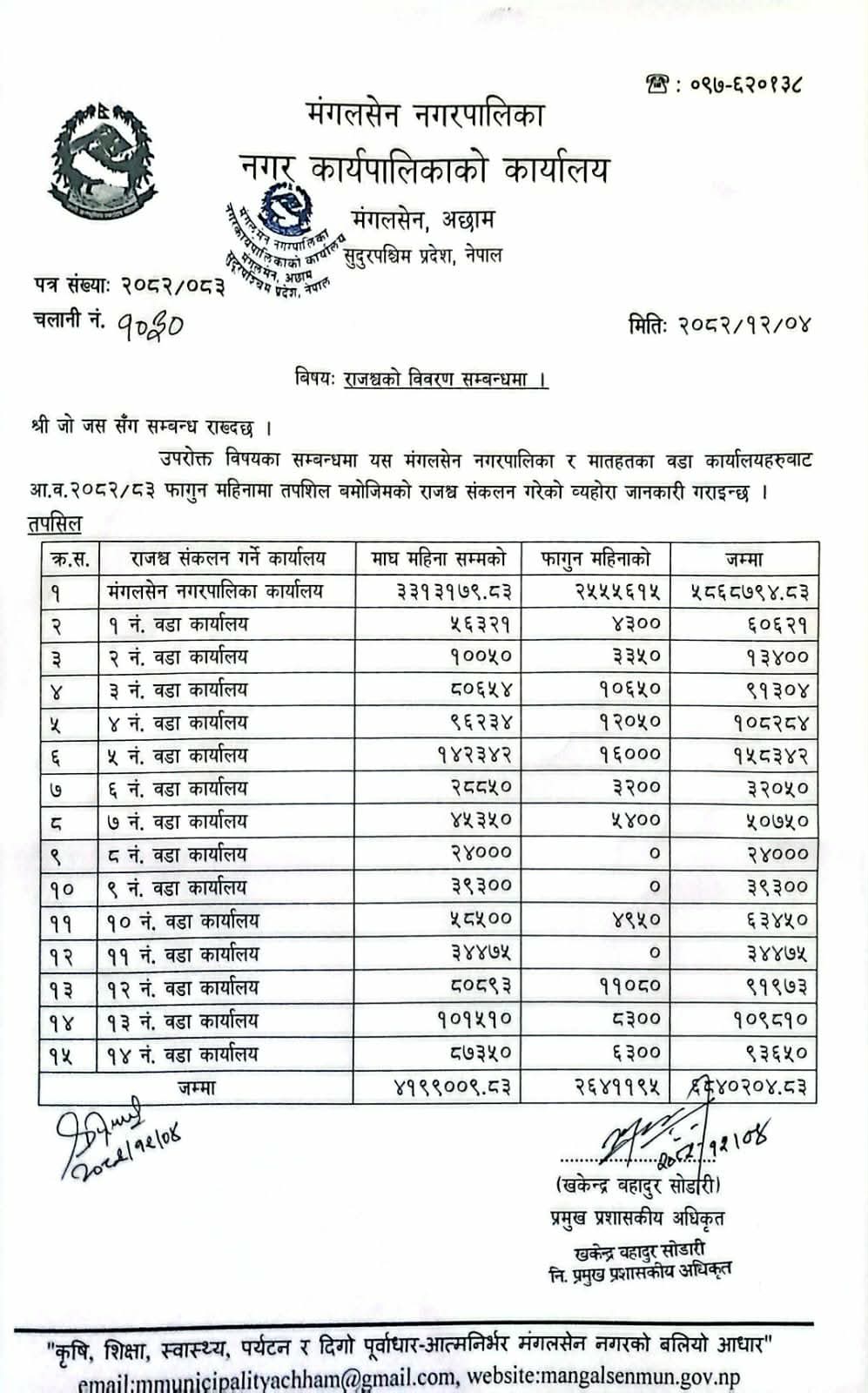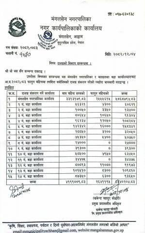 मंगलसेन नगरपालिका वडा कार्यालय ( १-१४ ) आ.व. ०८२/८३ फागुन महिनाको राजश्वको विवरण |